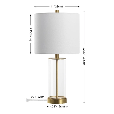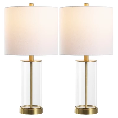 Introducing the Anders 22.25 inch clear brass glass table lamp set of 2, where form and function come together in perfect harmony. These lamps offer a sophisticated touch to any living space with their clear glass body and brass accents that create an aura of modern elegance. Their sleek design complements both contemporary and classic interiors, making them a versatile addition to your decor. Each lamp is fitted with a fabric shade that gently diffuses light to create a warm, inviting ambiance, ideal for relaxation or intimate gatherings. Perfectly sized to fit on side tables, bedside stands, or office desks, these lamps are designed to provide an appealing visual element without overwhelming the space. Enhance your environment effortlessly with the Anders lamp set and let its subtle charm take center stage. Its tasteful aesthetics and practical function make this a delightful choice for those who seek understated beauty in their home decor.
